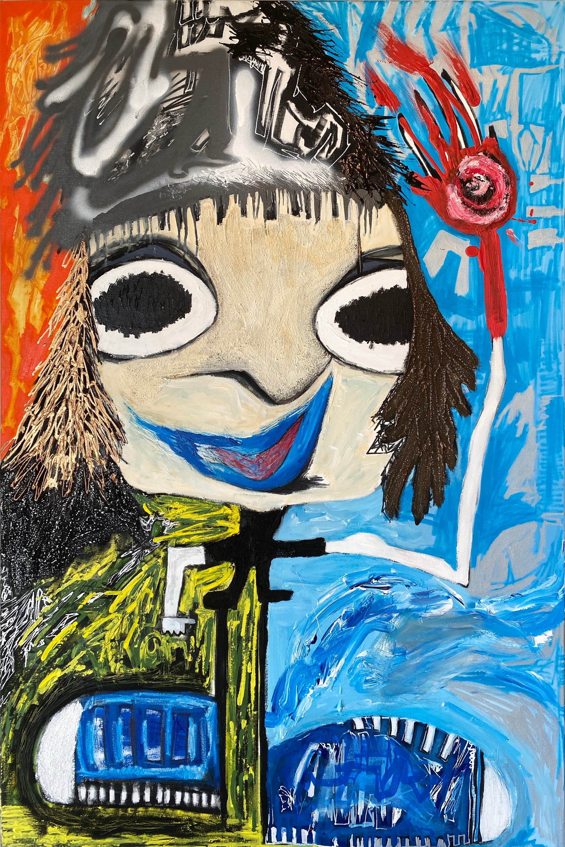 This HHR painting is in my Collection ‘HHR Copying HHR’ and it is a variant of a small drawing (the original in the Collection - see photo no 2) that I made in the beginning of 2025 when I joined the Network Artmoney for a little while. It is numbered [1/2] which means 1/ for the original and /2 for the second original variant). This painting measures 100x150cm and is made with acrylic paint and marker, oil pastel, soft pastel, spray paint, sand, gesso and eraser liquid. It was made ready for when I represented the HHR paintings and drawings for the first time at THE ART FAIR Kunst for alle in October 2025.