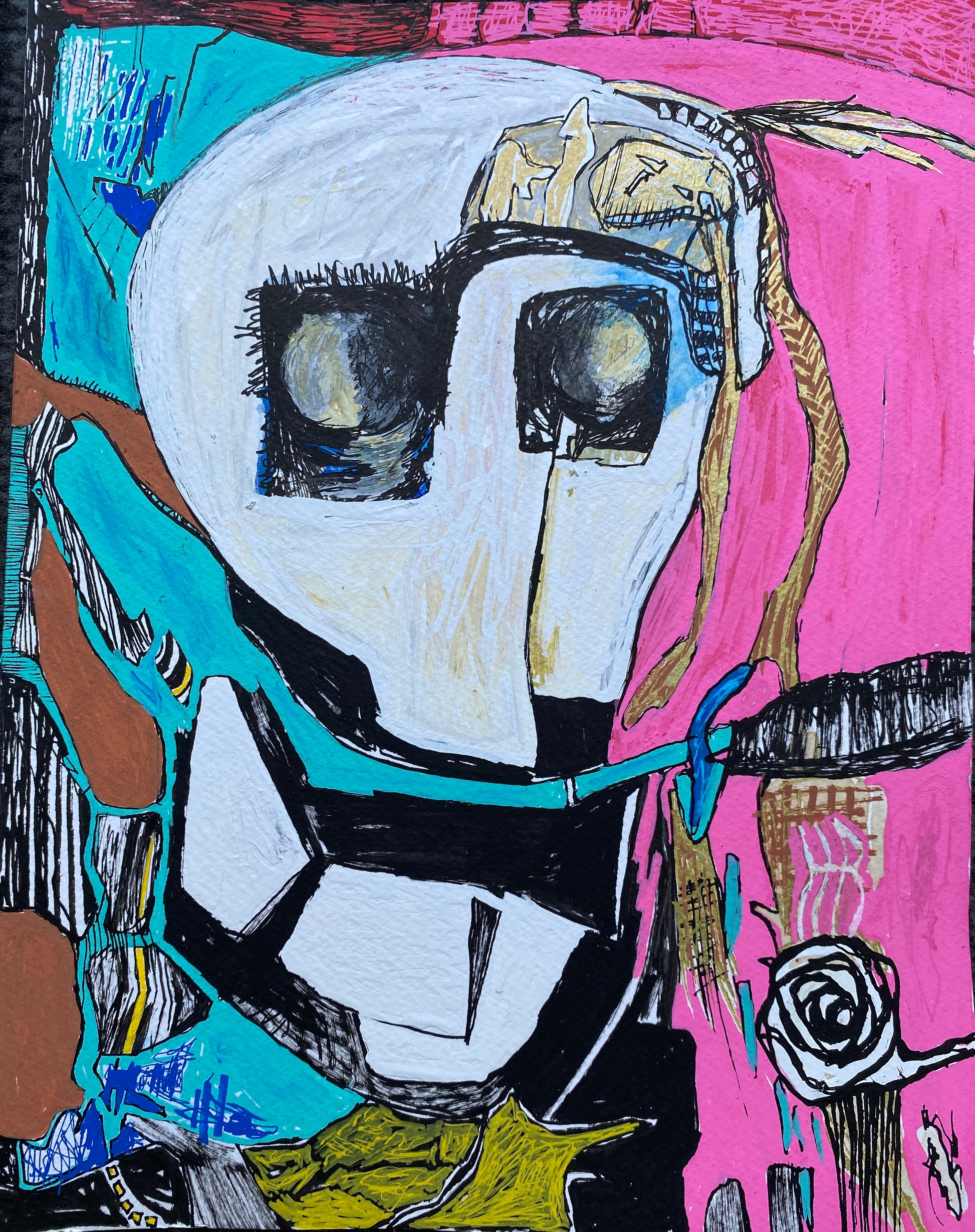The Original 'Globe Head' measures 120cm x 100cm, its made September ‘24 on canvas with acrylic paint, acrylic marker, coffee, graphite, oil pastel and sand.