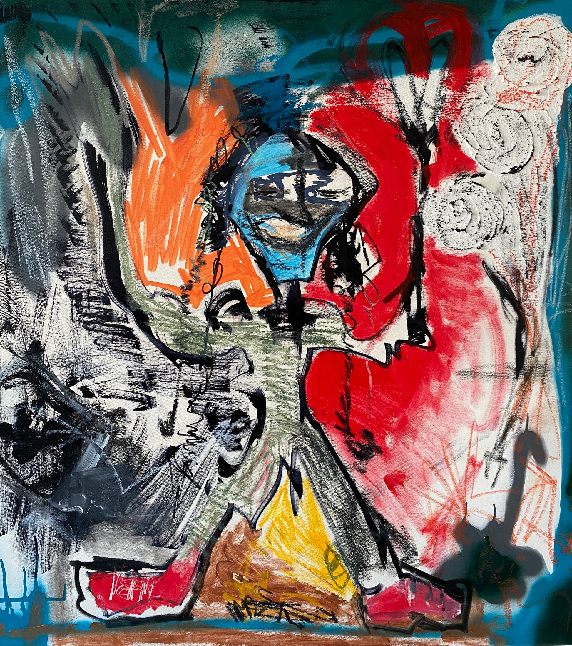 Currently not for sale! This Show Painting was made at The Tiny Drift Show (@tiny.drift) in December 2024 on a pre-prepped canvas to Live Poetry performance by Abéling Raastoff ! It measures 100cmx100cm and is made with acrylic paint and marker, spray paint, oil pastel and sand.